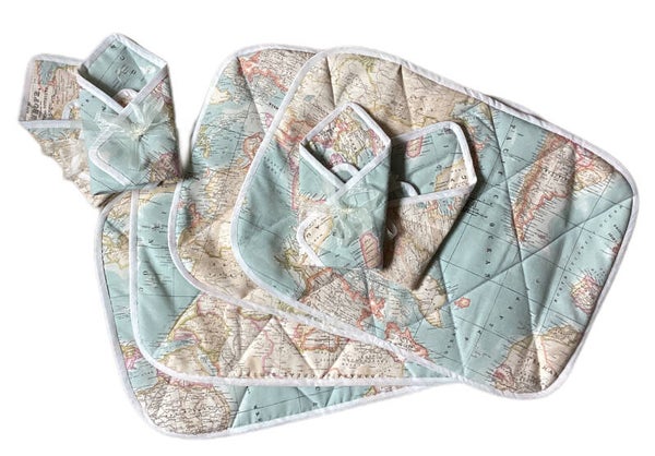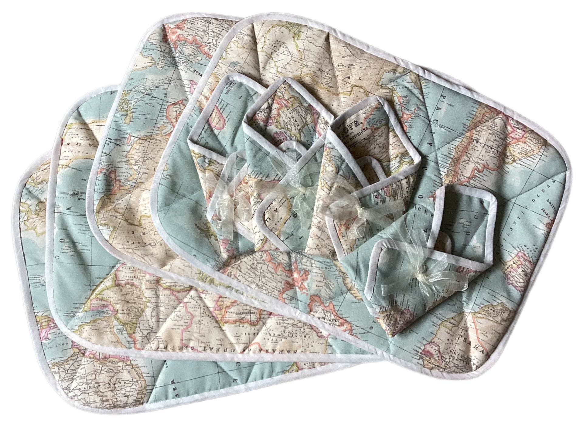Placemats gemaakt van wereldstof. Gewatteerd en doorgestikt. Afgewerkt met biaisband.